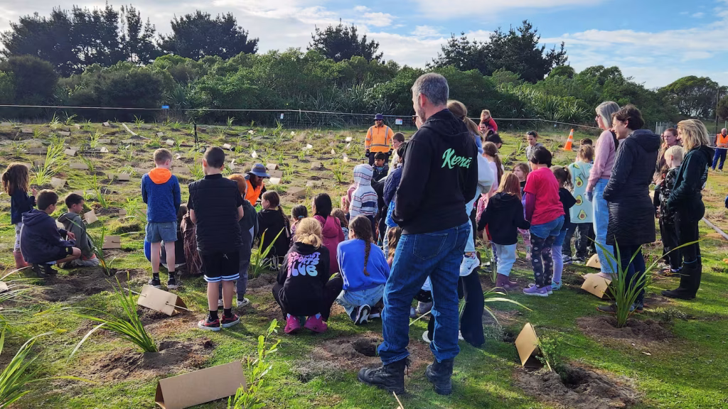The KCDC Parks team joined Kapakapanui School and Waikanae School for a day in the wintry sunshine planting 1500 trees at Pharazyn Reserve on Arbor Day, which in NZ is 5 June and has been marked since 1977.